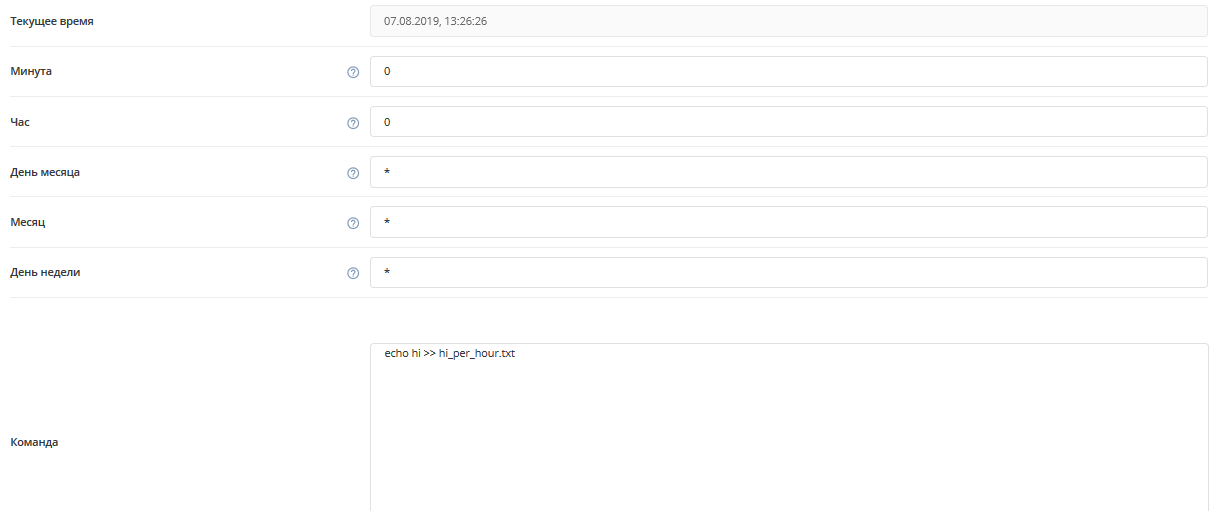 Cron задачи — это системные команды, которые можно запланировать. Например, если вы хотите, чтобы значение «привет» добавлялось в текстовый файл каждый понедельник утром, вы можете сделать это через меню cron задач. Можно задать следующие значения: минута, час, день, месяц и день недели (Понедельник-воскресенье; числа 0 или 7 представляют воскресенье). Любое значение можно проигнорировать, поместив звездочку ( * ) в текстовое поле.