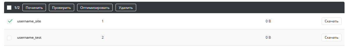 Вы также можете починить, проверить и оптимизировать базу данных. Для этого поставьте галочку рядом с нужной базой данных, и в появившемся меню выберите соответствующий пункт и панель управления хостингом автоматически сделает все за вас!