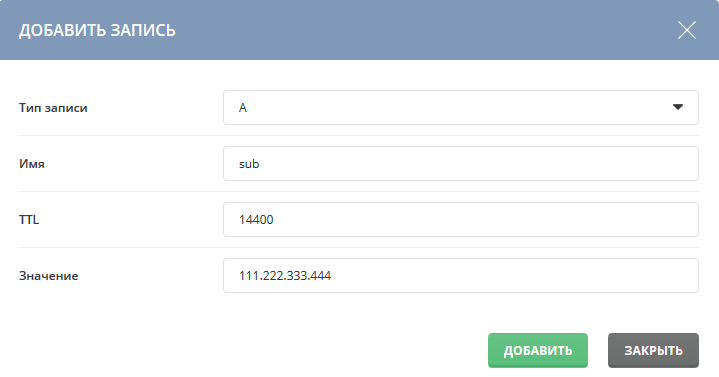 Примечание: Если нужный вам IP-адрес имеет формат IPv6, то необходимо добавить AAAA запись такого же вида.