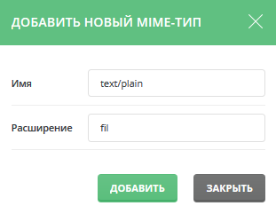 Mime-типы позволяют установить то, как браузер будет открывать веб-файлы. Чтобы добавить Mime-тип нажмите на кнопку «Добавить Mime-тип». В открывшемся окне введите название Mime-типа, а затем расширение без точки. Mime-типы должны использоваться только опытными пользователями.