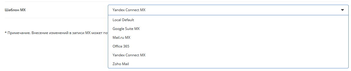 Шаблоны MX позволяют в один клик изменить MX-записи в соответствии с инструкциями популярных почтовых сервисов. Так же вы можете вернуть значения к исходным выбрав шаблон «Local Default».